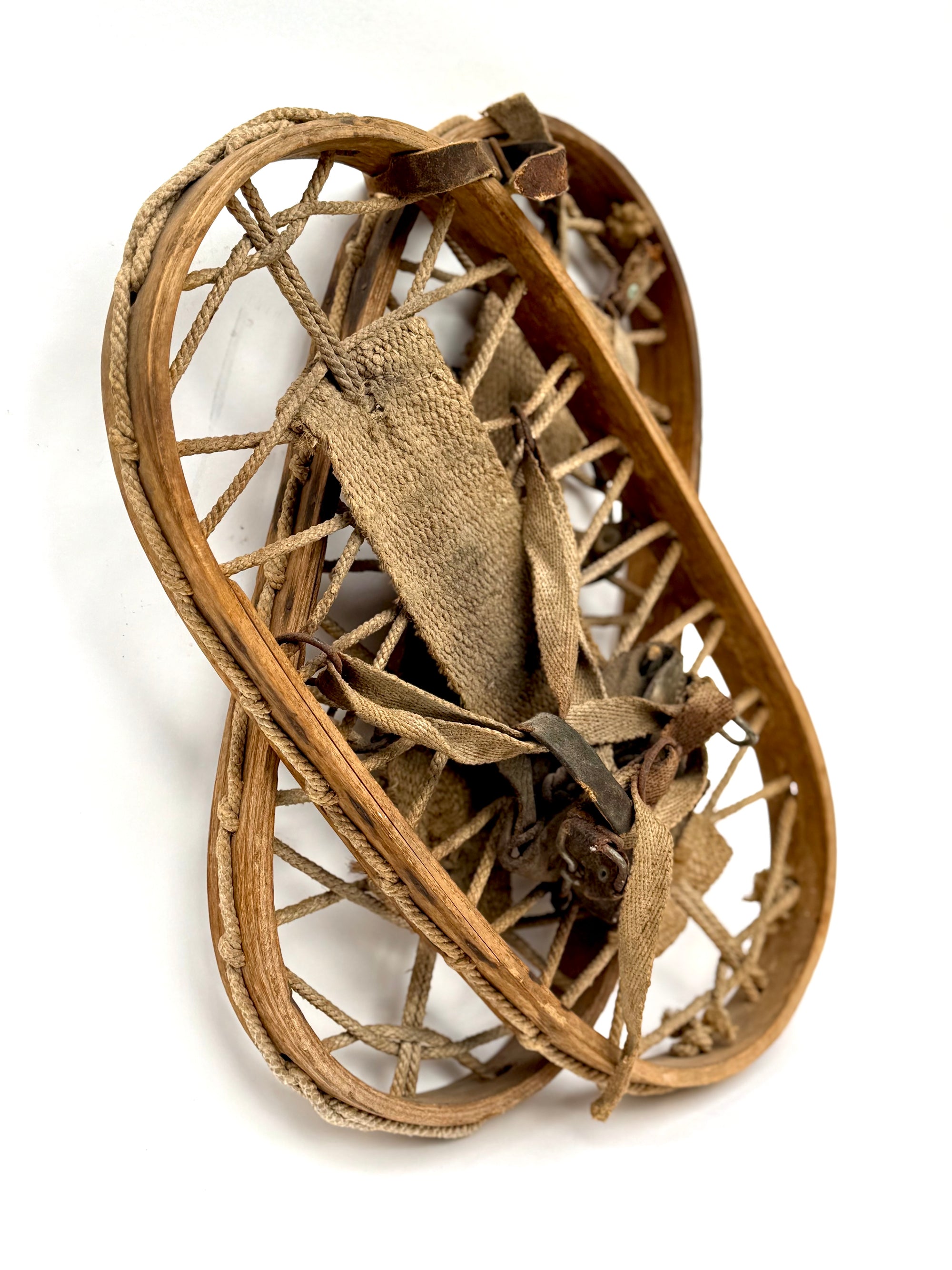 A wonderful set of wooden oval shaped snowshoes crafted as utilitarian with original designs for WWII. These vintage snowshoes feature bent wood frames laced with waxed cotton rope. Smaller in size and easily stored in a rucksack until needed during battle.