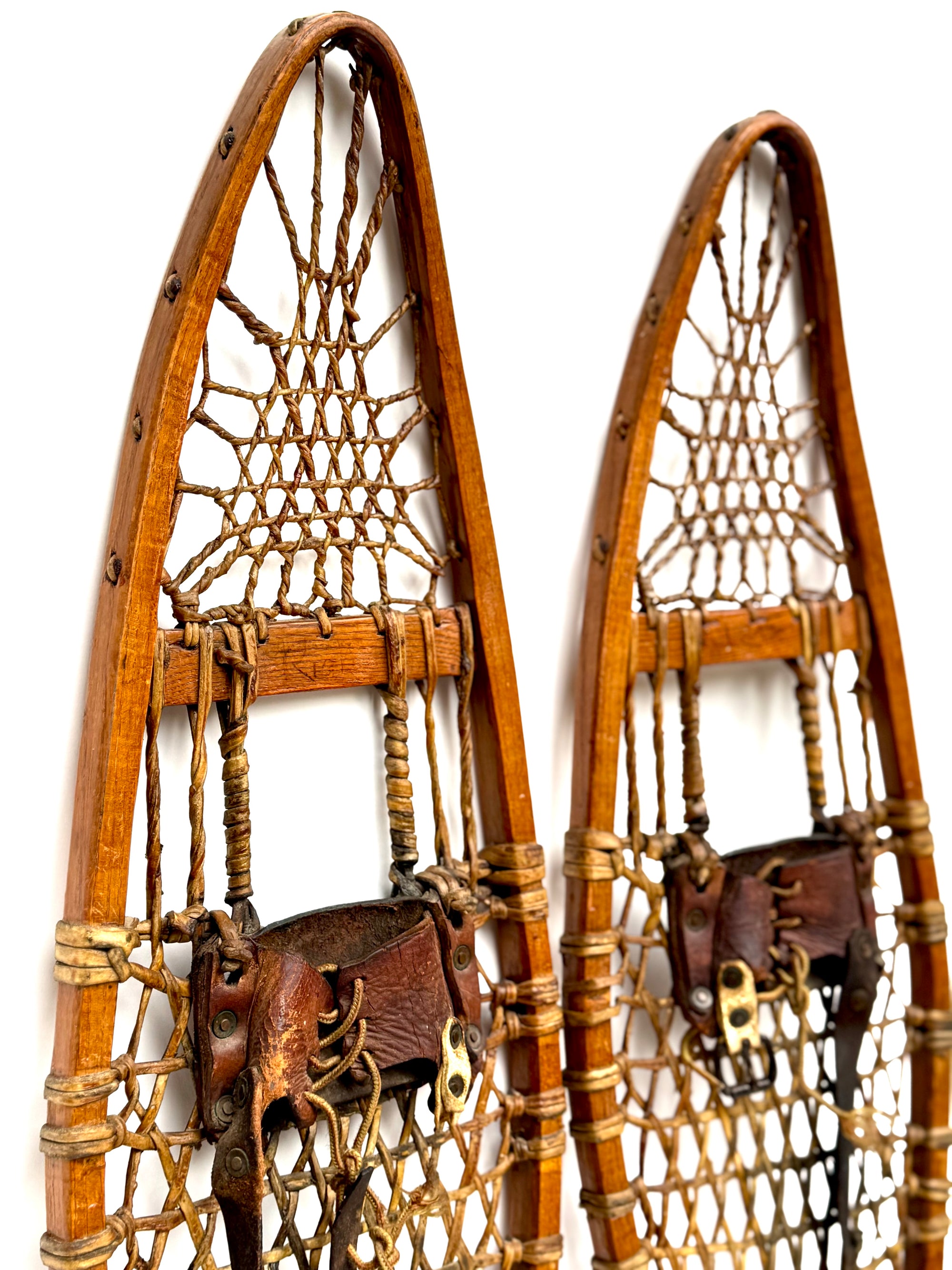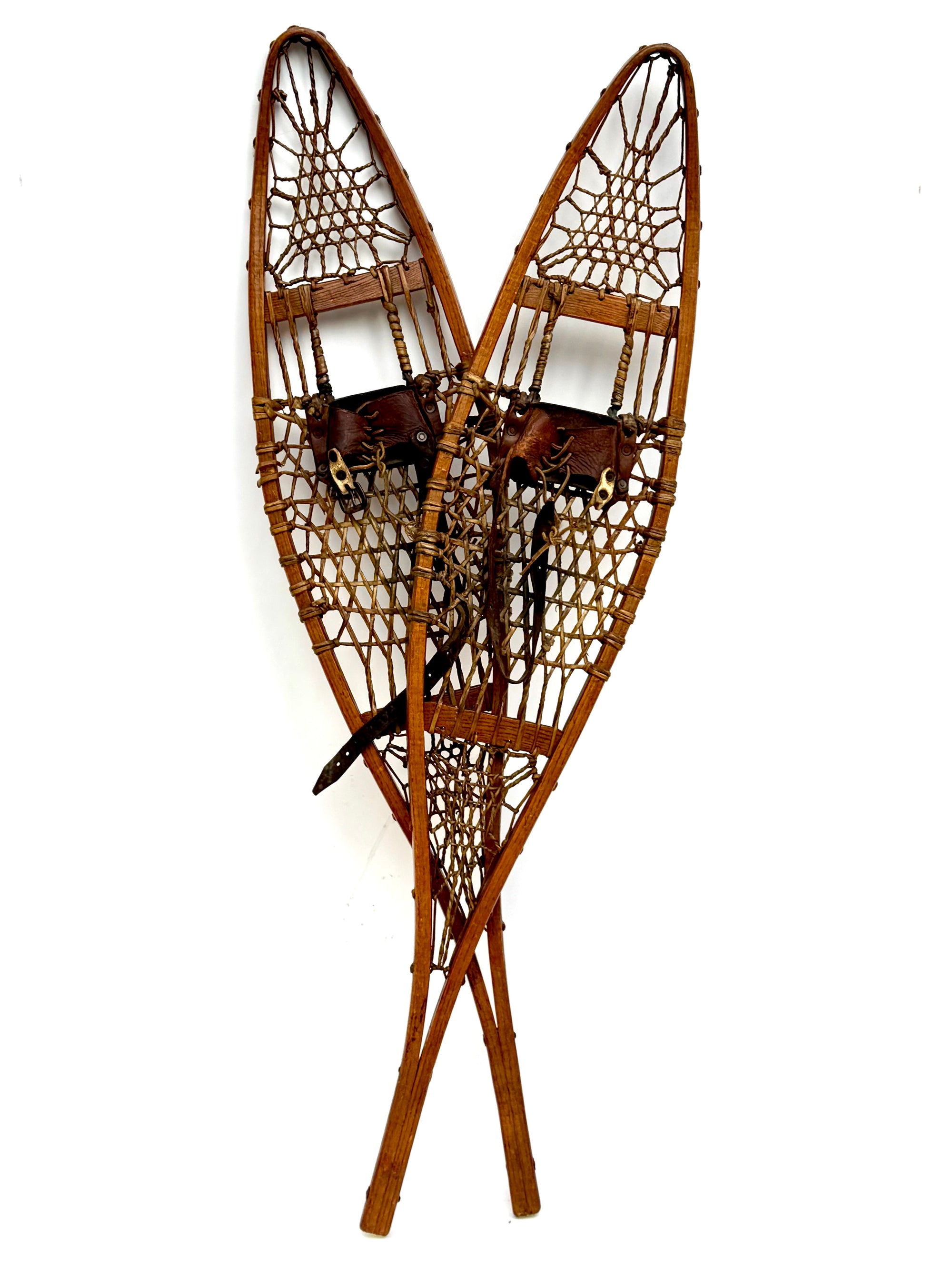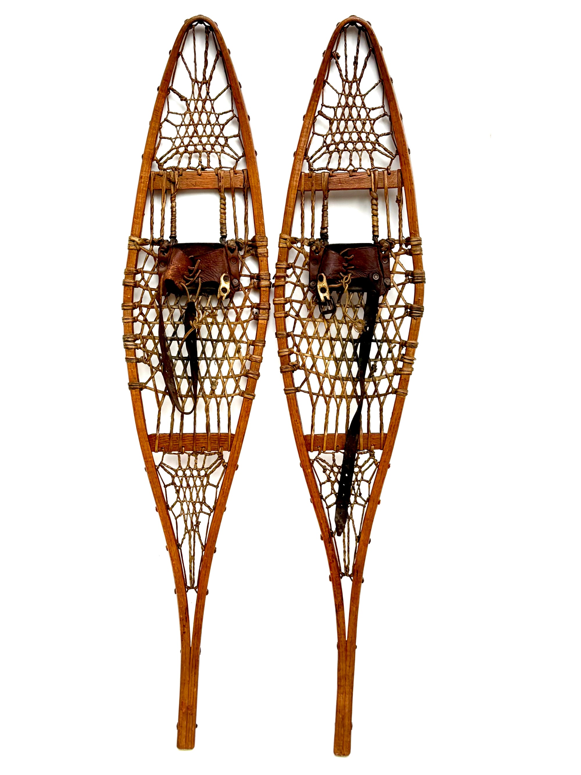 This is a beautiful set of Native American snowshoes, woven with thick animal hide and fitted with traditional leather strap bindings. The original red pom-pom tribal markers remain visible—worn with age, but still present. The snowshoes carry a rich, natural patina that has recently been preserved with a coat of natural beeswax.