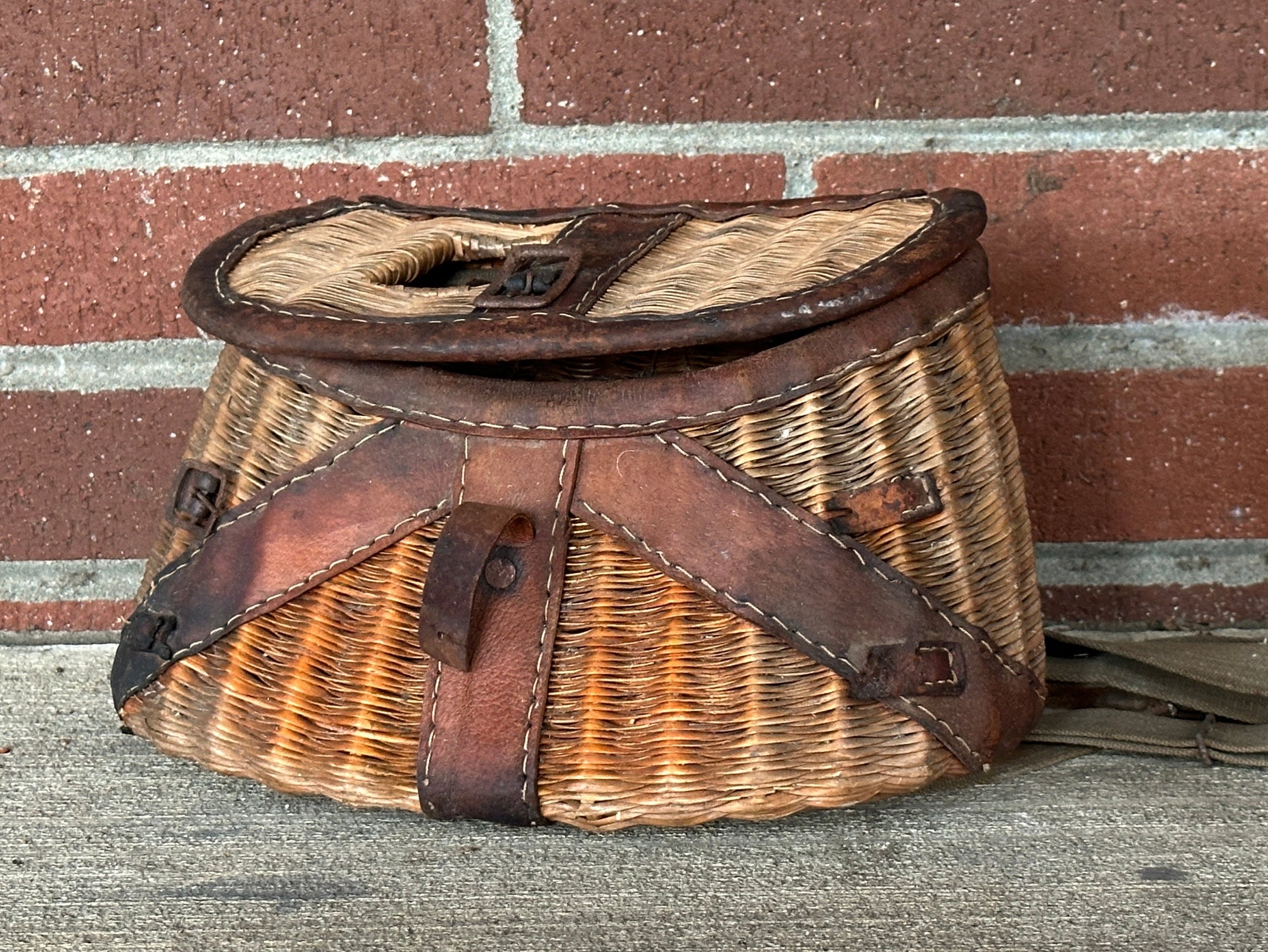 Woven Reed style spit reed fishing basket. Decorative leather and canvas strap and corner reinforcements. This fishing creel is in nice shape and ideal for decor. The leather is in good condition. This is the style creel we would see being used as decor for a cabin mantel display, or in a gentleman's library.