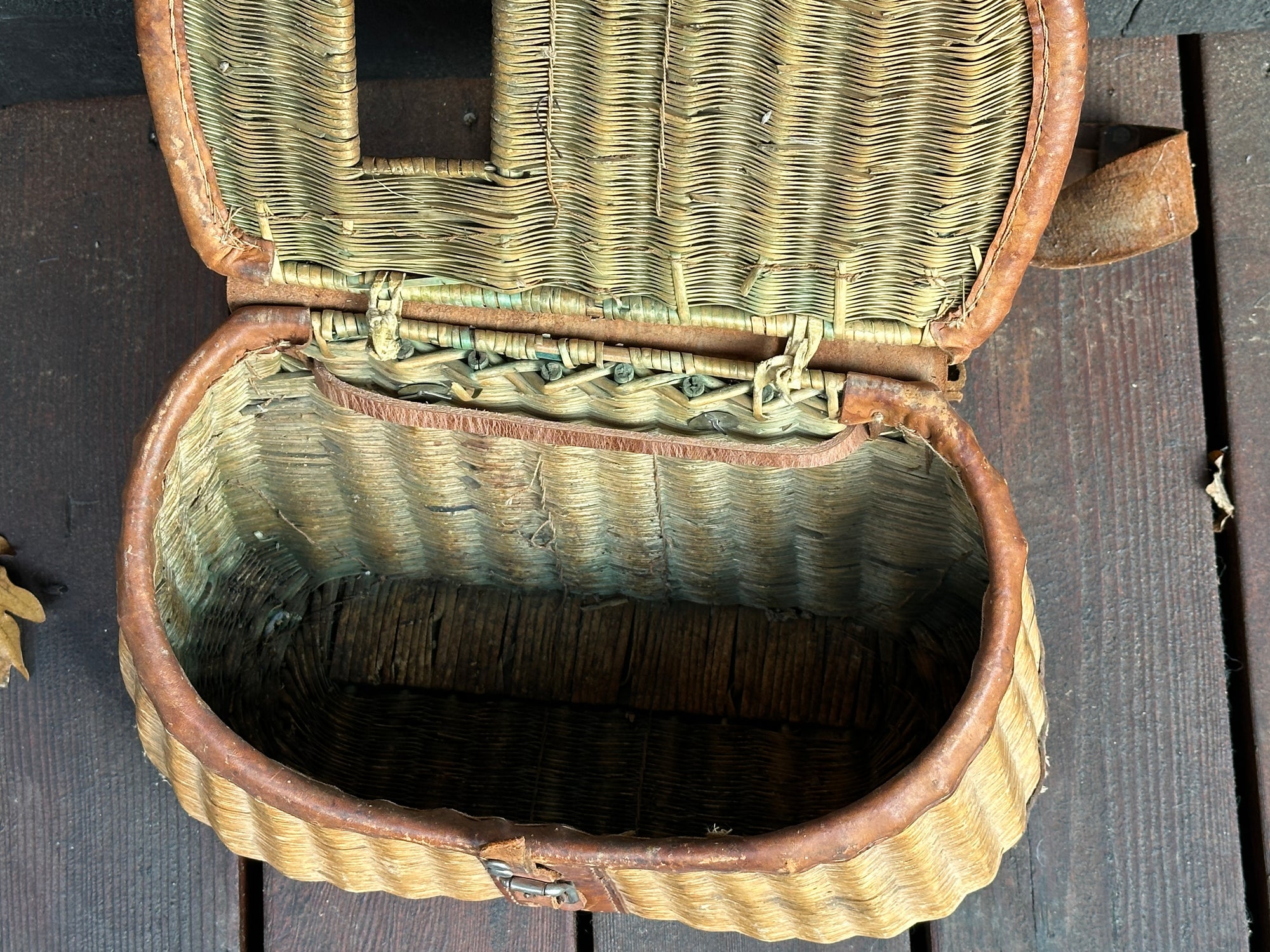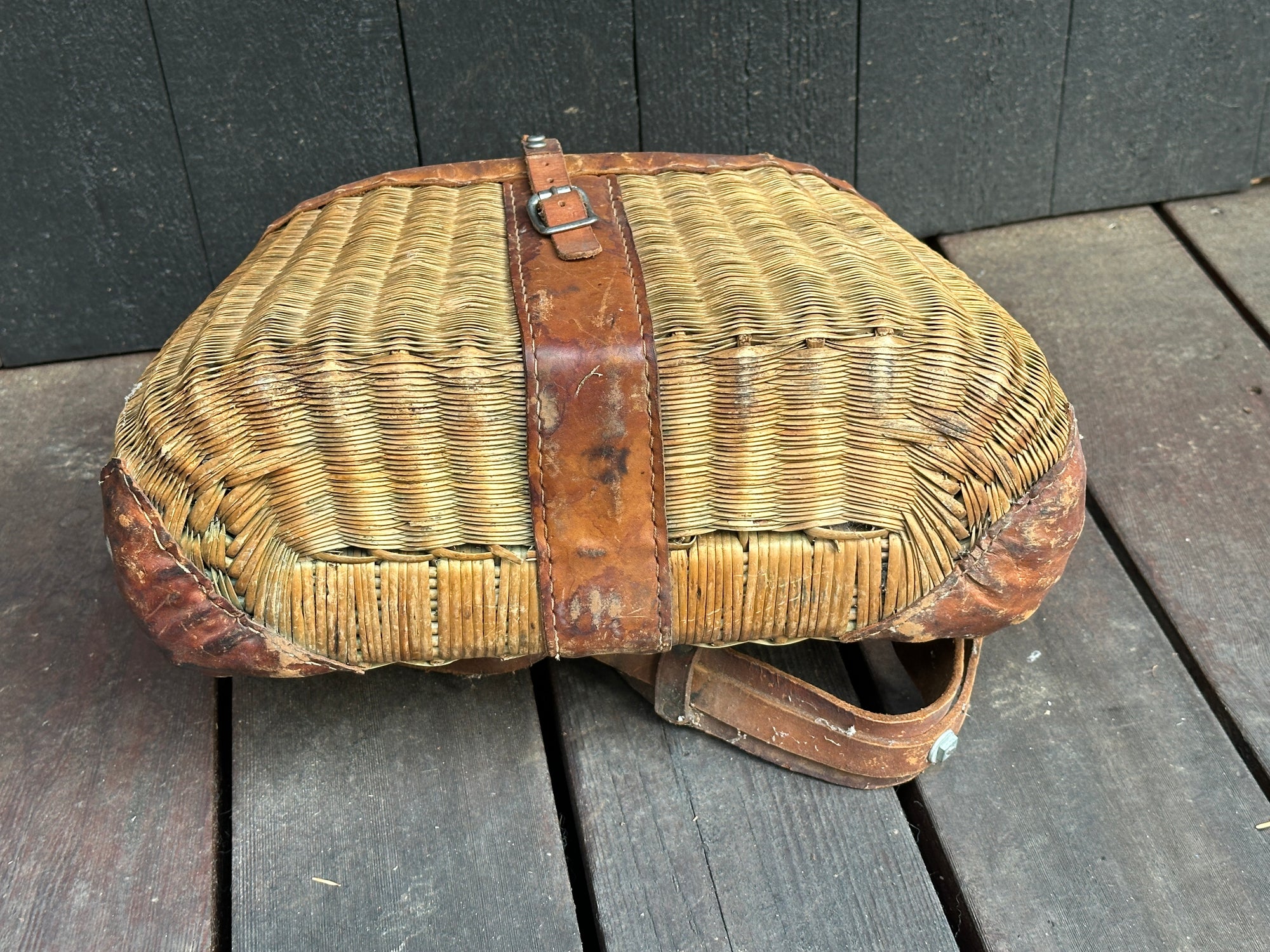 Split Reed style fishing basket. Decorative leather shoulder strap. This classic style fishing creel is in good condition. This is the style creel we would see being used as decor for a cabin mantel display, or in a gentleman's library. Many of our designer customers prop these up on the bookshelf.