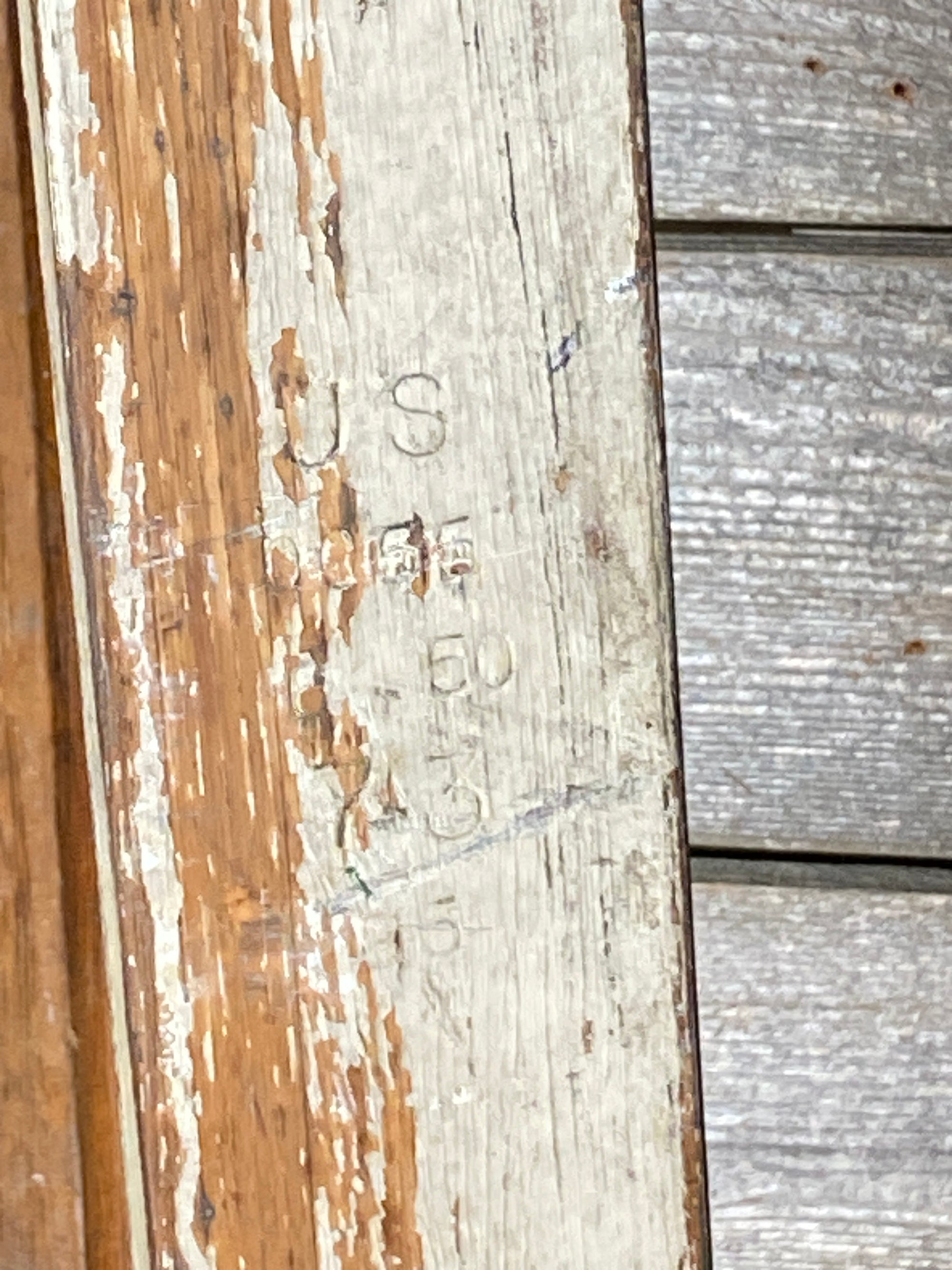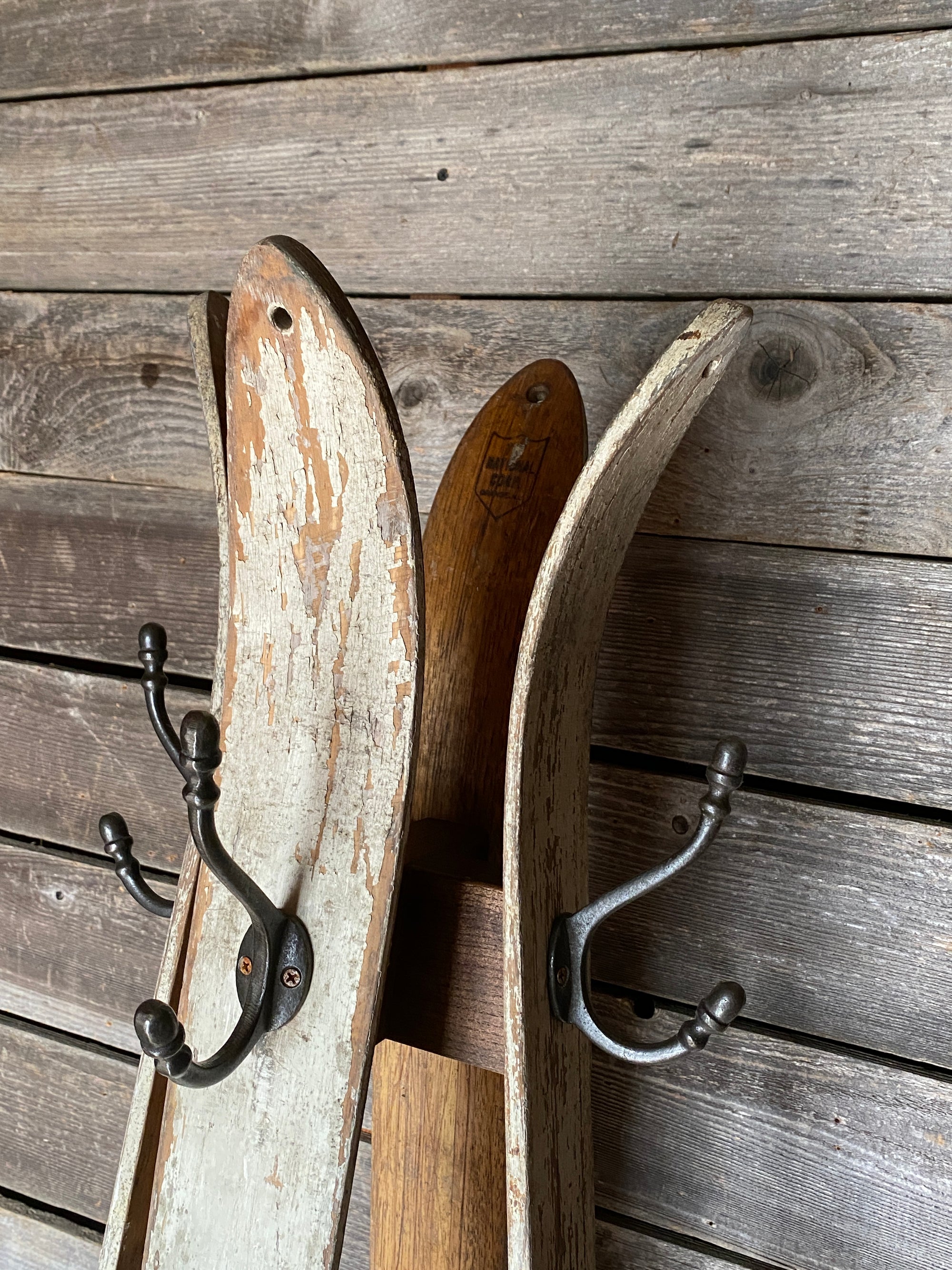 Made with true authentic vintage military skis from the 1940s-1950s. US Army troops that trained for Winter - had skis painted white for snow camouflage. The holes at the top of the skis were designed in case a soldier was injured, a rope could be woven through and the skis could be used as a sled. Incredible history and very unique piece.