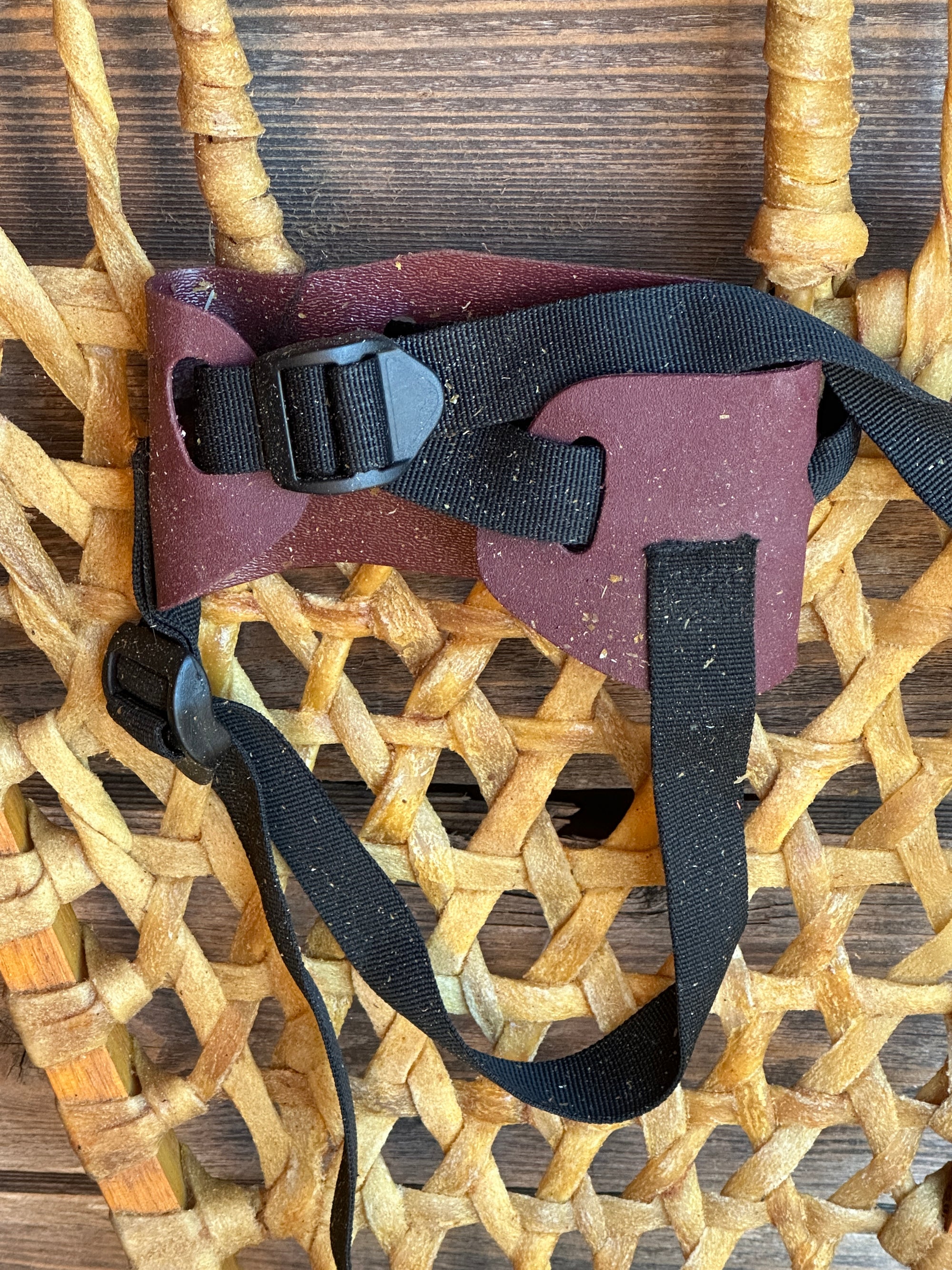 A fine example of White Ash Canadian Snowshoes. This set is in excellent condition and could still be used today (good size for adults ~100-170lbs). Thick raw hide lacing and stout white ash frames combine to make a very strong and sturdy snowshoe. This particular set is the classic teardrop shape and has the original leather/webbing bindings in very good condition. A great set of snowshoes for the trail or wall.